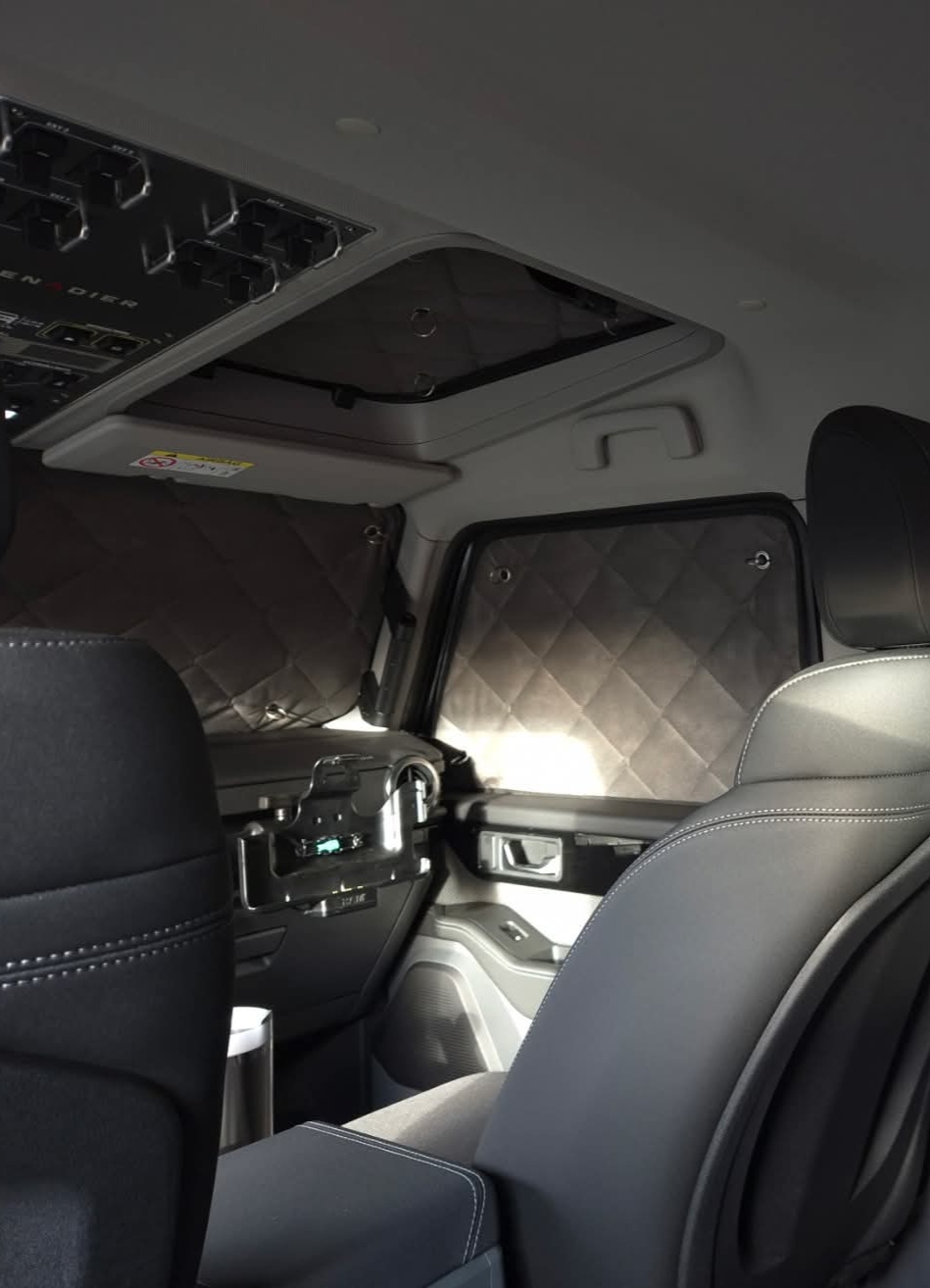 Erweitere deinen Grenadier mit echter Wertarbeit. Unsere BlidimaX Isolation für die Safari-Fenster (über der 1. Sitzreihe) wird in deutscher Manufakturarbeit gefertigt und ist weit mehr als nur eine Abdeckung und UV-Schutz. Hochwertiges schwarzes Einfassband und robuste schwarze Saugnäpfe sorgen für eine dezente Optik und eine sichere, langlebige Befestigung.