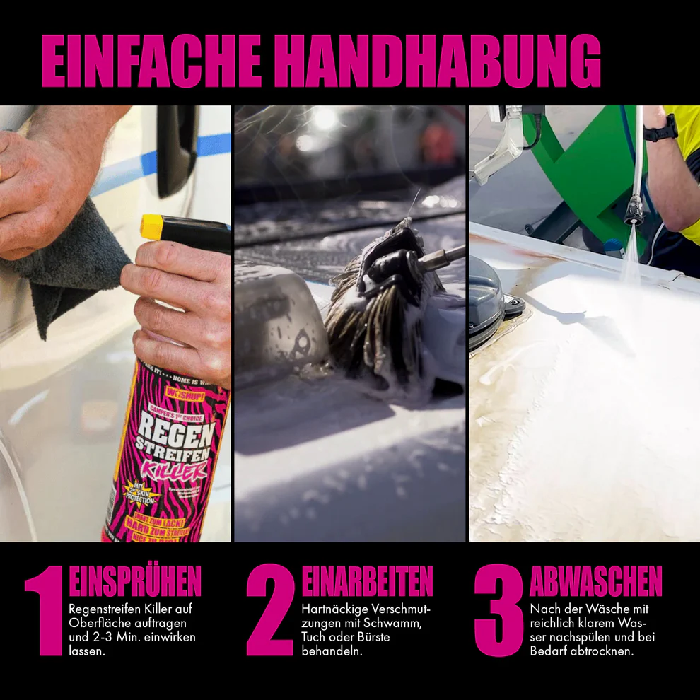 Am besten wird der Regenstreifen Killer punktuell auf Regenstreifen, Grünspan oder verfärbten Silikondichtungen angewendet. Den vorgewässerten Camper einmal mit dem Produkt einsprühen, 2-3 Minuten einwirken lassen, dann mit einer Bürste oder einem Schwamm einarbeiten und abschließend nur noch mit Wasser abspülen. Das war’s schon!