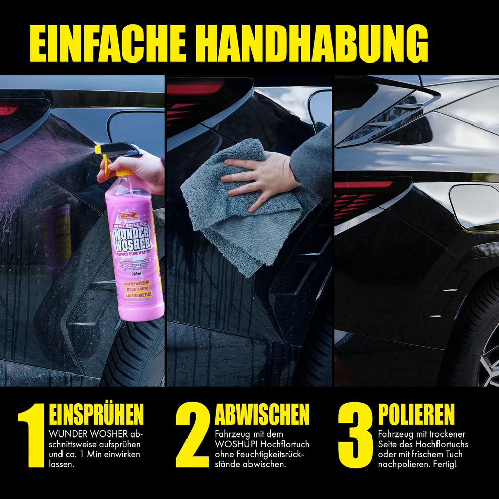 Der Wunder Wosher kann überall und jederzeit einfach benutzt werden. Dafür einfach aufsprühen, mit einem unserer Hochflortücher abwischen, Schmutz wird dabei von den Silikonen im Reiniger ummantelt und vom Hochflortuch eingeschlossen. Anschließend mit der feinen Seite des Tuchs polieren. Das Tuch kann anschließend einfach bei 60 Grad ohne Weichspüler gewaschen werden. Das war’s! Er kann sogar auf Kunststoffteilen im Innenraum, für Fahrräder, Motorräder und vieles mehr verwendet werden!