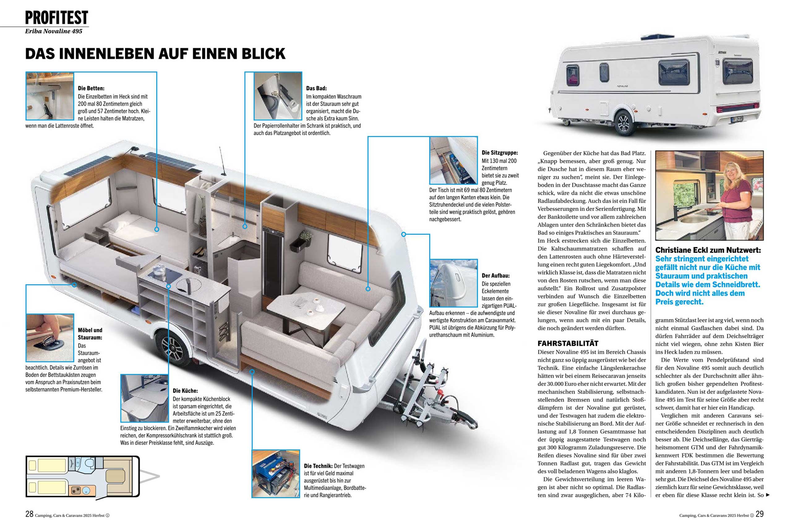 Der Eriba Novaline 495 steht im Mittelpunkt des neuen Hefts von Camping, Cars & Caravans und musste sich im Profitest einem intensiven Check durch das Expertenteam stellen. Im aktuellen Heft prüft Karosseriemeister Rudi Stahl unter anderem die Verarbeitung, Materialqualität und Detaillösungen des Aufbaus. Besonderes Augenmerk lag auf den neuen Glattblechwänden, der Dachkonstruktion aus GfK und der breiten Eingangstür mit Fliegenschutz.